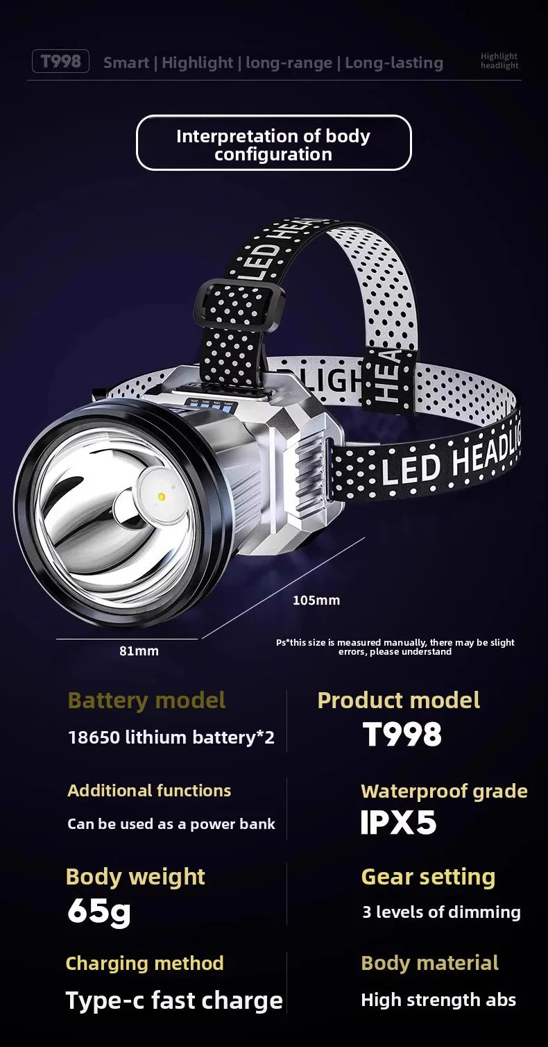 Headlight head mounted strong light charging ultra bright fishing special ultra long endurance lithium battery flashlight mining