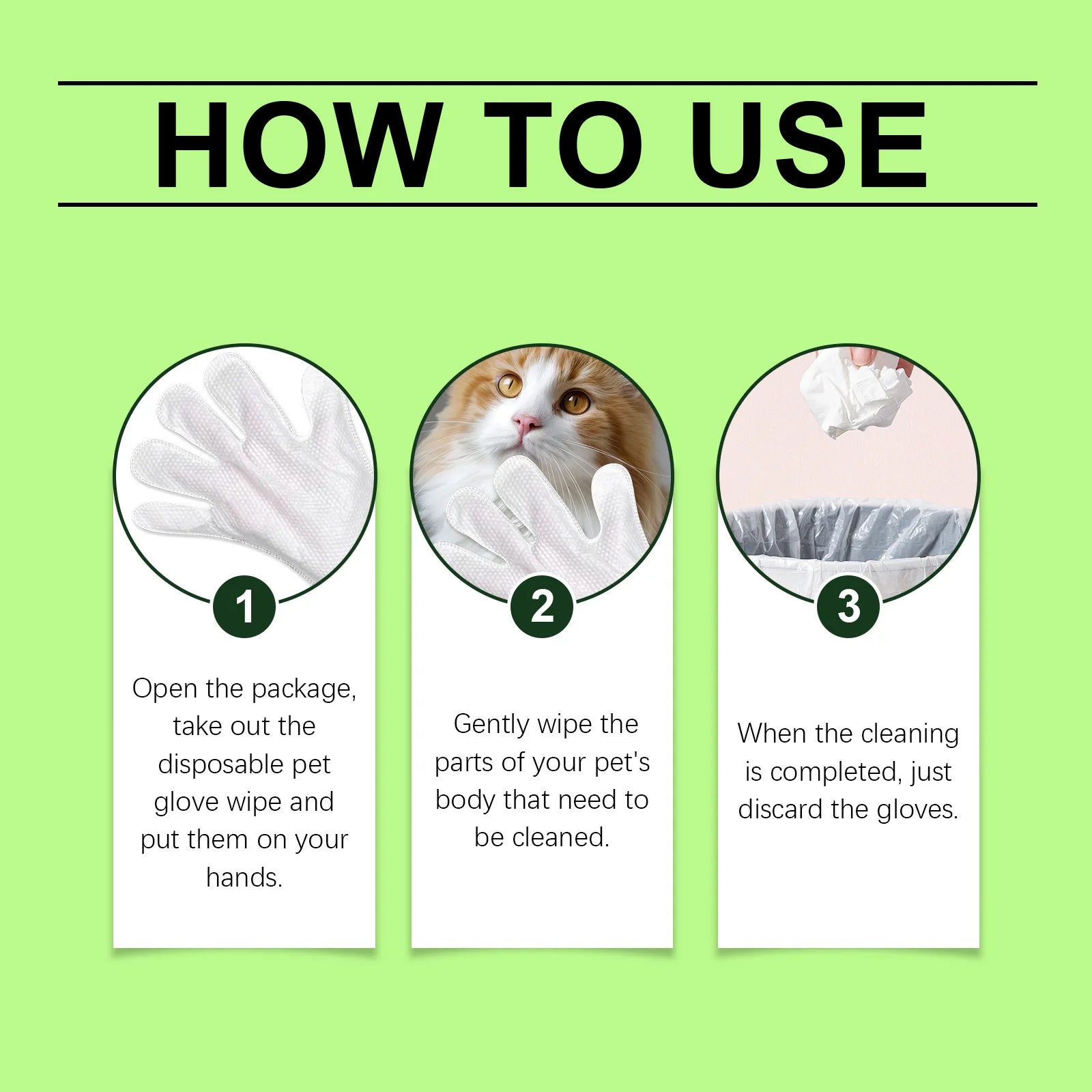 Pet glove wet wipes for dogs and cats, hypoallergenic, single-use, no rinsing required, 5-piece pack.