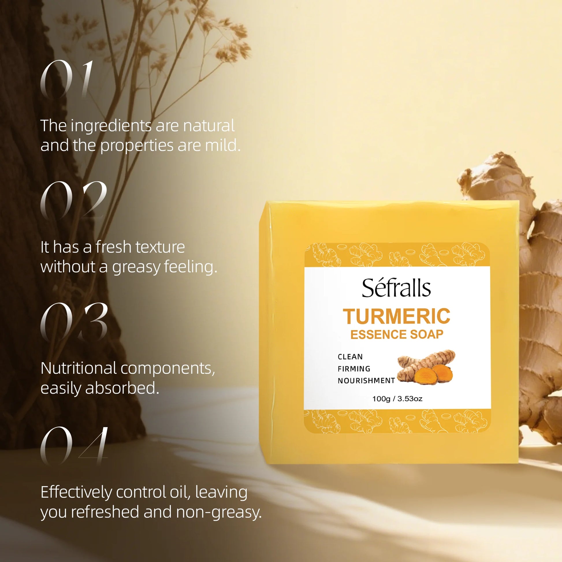 Turmeric Essence Soap (100g): Rich, creamy lather removes impurities, excess oil, and pollution residue while infusing skin with turmeric’s brightening power.